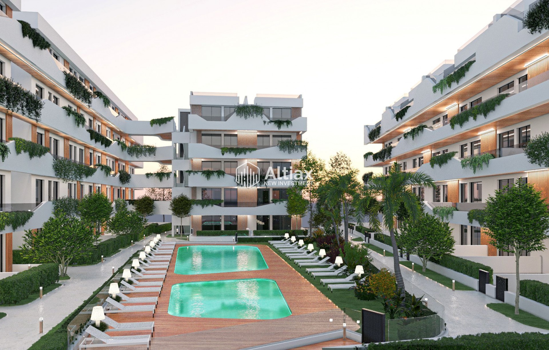The outdoor environment of this residential is carefully designed to offer a space of tranquility and enjoyment. The garden areas provide a natural and relaxing setting, ideal for outdoor walks or enjoying a moment of reading under the sun. Additionally, residents can enjoy a community pool, perfect for cooling off during warm summer days. Ground floor properties feature private gardens, offering additional space for outdoor leisure, while penthouses have solariums that allow for panoramic views and enjoyment of the Mediterranean climate.