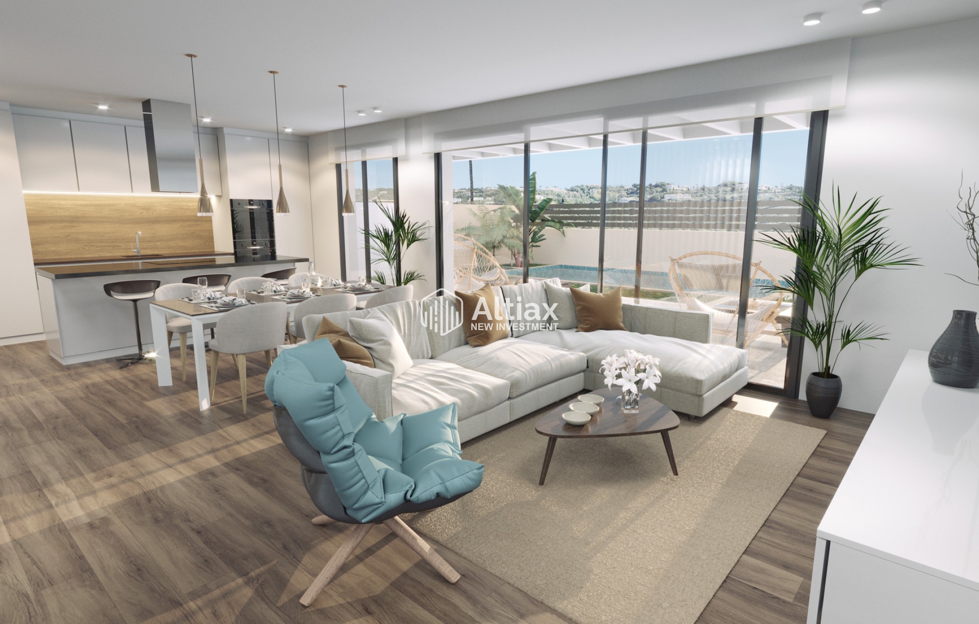 The exteriors of these detached homes in Finestrat are designed to offer a space for relaxation and outdoor enjoyment. Each property features a private garden, ideal for creating a personal oasis of tranquility. Additionally, the spacious terraces allow for the enjoyment of sea views and the Mediterranean climate year-round. The presence of a pergola adds a touch of elegance and functionality, providing shade and an additional space for outdoor entertainment. The inclusion of a private pool in each home ensures moments of leisure and fun in the comfort of your own home.