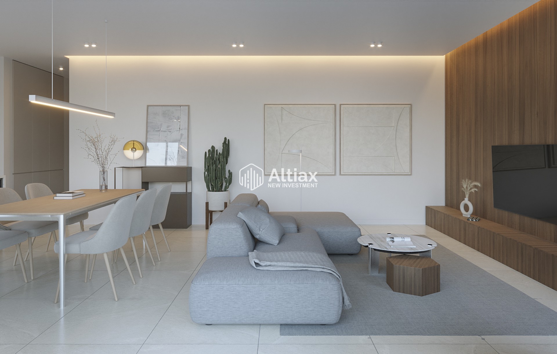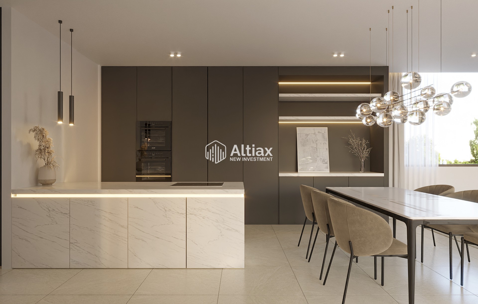 The interiors of these homes are carefully designed to offer comfort and modernity. Apartments, ground floors, and penthouses are available in 2 and 3-bedroom configurations, all with 2 bathrooms. The kitchens are fully equipped with modern appliances, and the homes come furnished, ready to move in. The climate control system includes air conditioning and underfloor heating, ensuring comfort throughout the year. Ceramic and porcelain tile floors add a touch of sophistication and are easy to maintain. Electric shutters and a video intercom add an extra level of convenience and security.