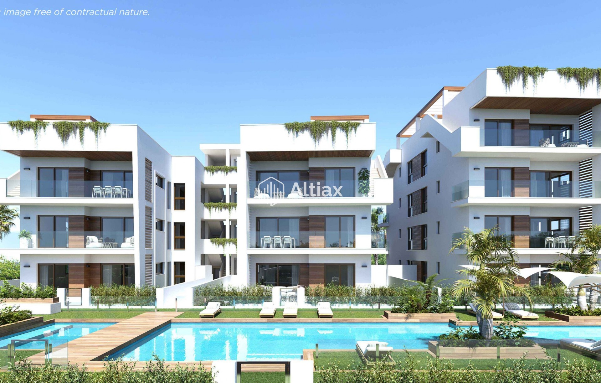 The outdoor environment of these ground floor homes is designed to maximize enjoyment of the Mediterranean climate. Each property features a private garden, ideal for creating a personal outdoor space. Additionally, the terraces provide a perfect spot for relaxation or outdoor dining. The community also offers spacious landscaped areas, adding a touch of nature and tranquility to the environment, complemented by a communal pool where residents can refresh and socialize.