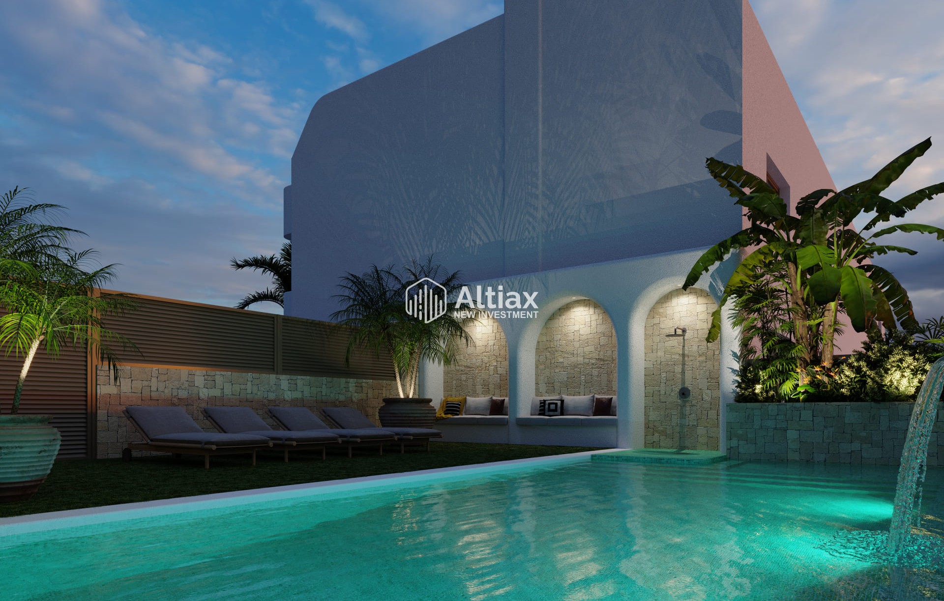 The exteriors of these properties have been designed to offer a space for relaxation and outdoor enjoyment. Each bungalow features a private garden, perfect for creating a personal oasis or an outdoor entertainment area. The spacious terraces allow for enjoyment of the Mediterranean climate year-round, while the solariums offer an ideal place for sunbathing in complete privacy. Additionally, the properties feature pergolas that provide shade and style, seamlessly integrating with the natural surroundings. The proximity to the sea, just 1 km away, adds extra value, allowing for coastal walks and water activities.