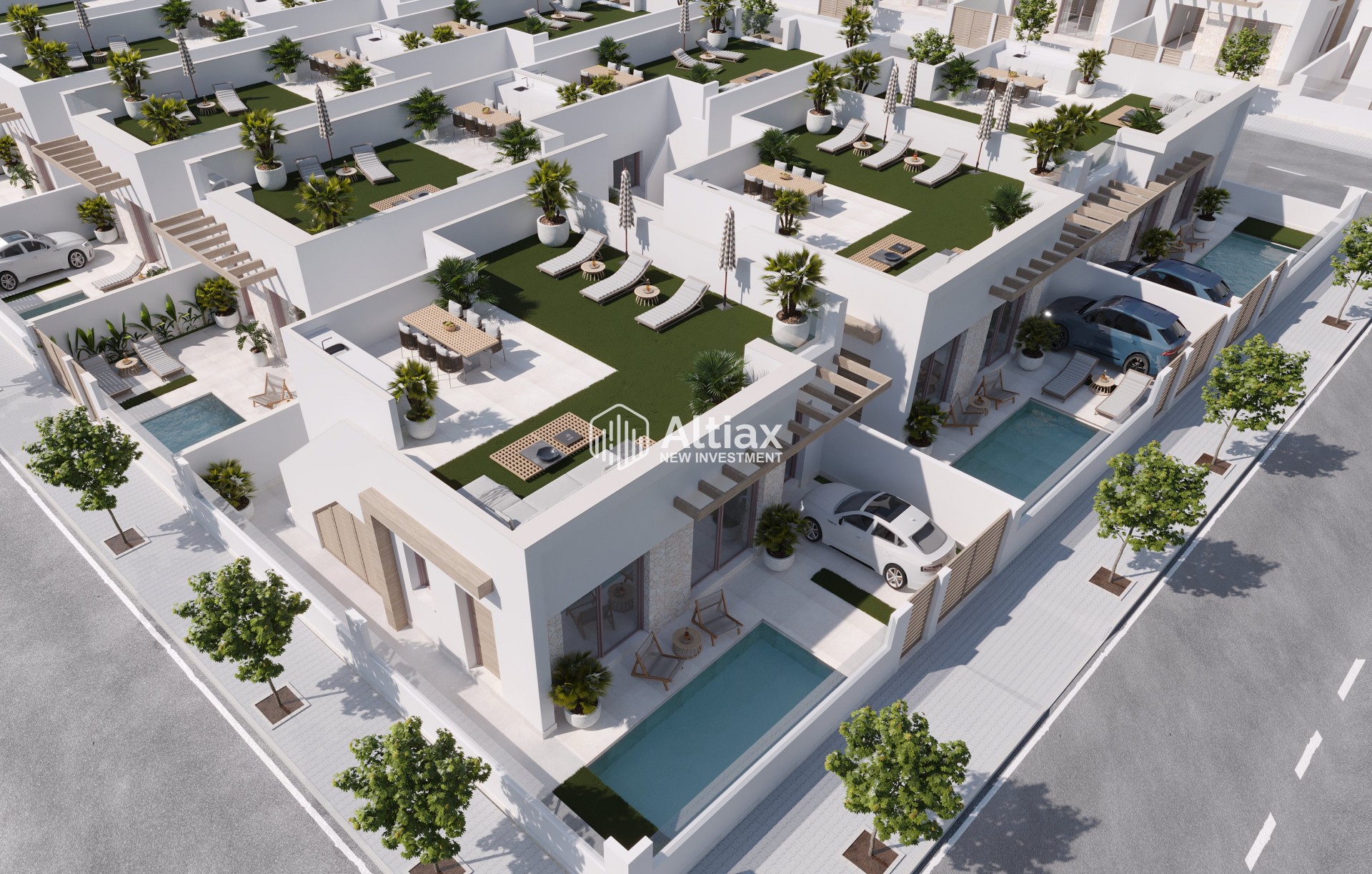 Les propriétés disposent d'un design extérieur qui invite à profiter du climat méditerranéen. Chaque maison dispose d'un jardin privé, idéal pour créer un espace vert personnel ou pour profiter d'activités en plein air. La terrasse est un autre atout, offrant un lieu parfait pour se détendre ou partager des moments avec des amis et la famille. De plus, chaque propriété comprend un solarium, offrant un espace supplémentaire pour bronzer ou simplement profiter de la vue. L'inclusion d'une piscine privée dans chaque maison ajoute une touche de luxe et de confort, permettant de se rafraîchir lors des journées les plus chaudes.
